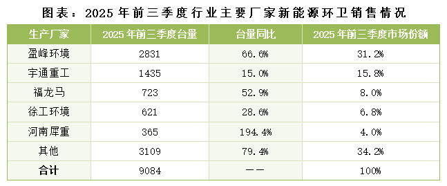 新能源环卫市场呈现高集中度特征,CR5占比高达65.8%。2025年前三季度,盈峰环境凭借2831台的销量,领先优势明显。宇通重工、福龙马、徐工环境分列二、三、四位。