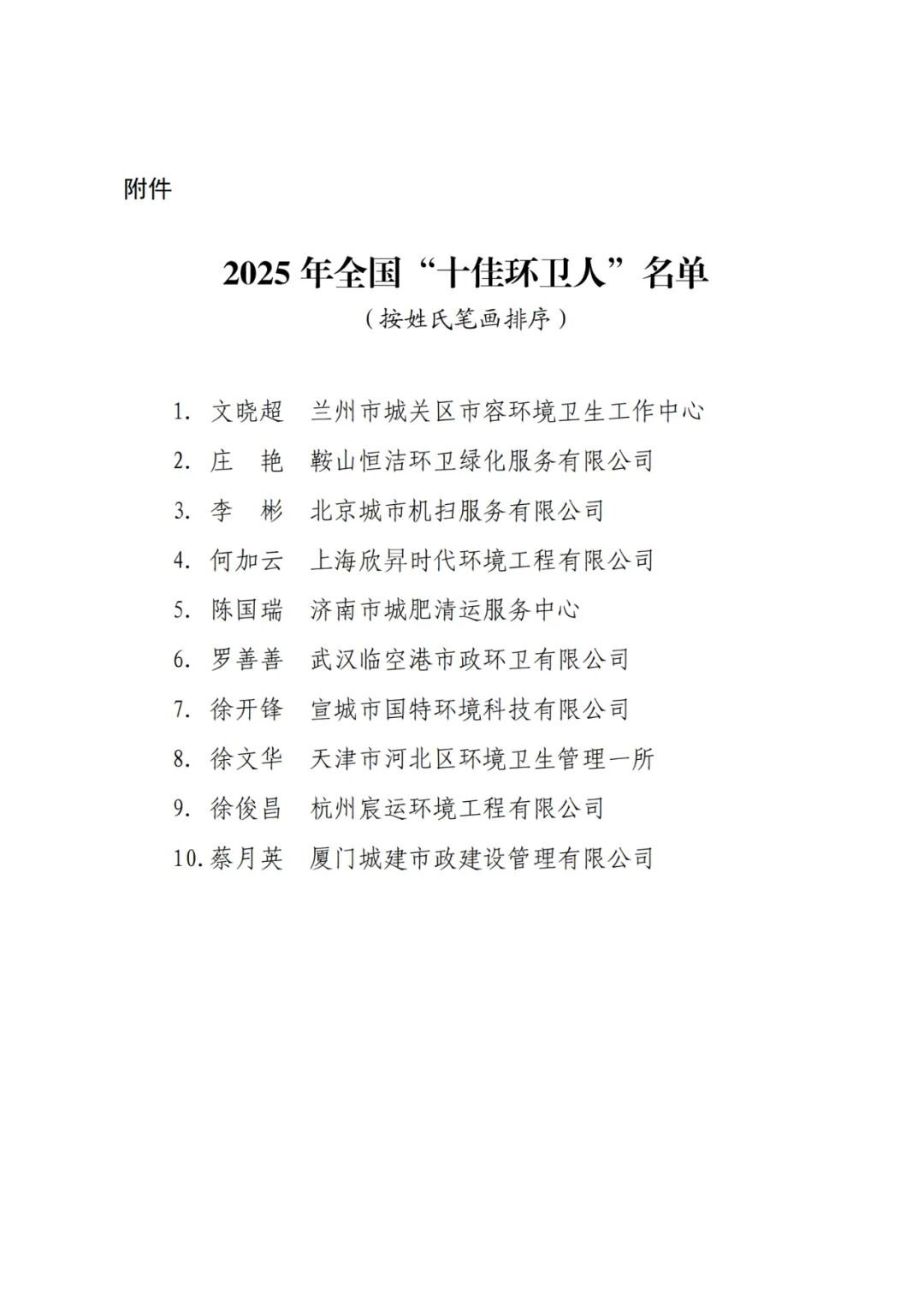 长期以来,广大环卫人在城市环境卫生管理及作业一线,努力拼搏、担当奉献,为保障城市环境卫生,提升人居环境质量作出了重要贡献,涌现出一批先进典型和感人事迹。为大力弘扬劳模精神、劳动精神、工匠精神,充分展现新时代广大环卫人风采,营造尊重关爱环卫工人的良好氛围,提升环卫从业者的职业荣誉感和行业归属感,促进城市环境卫生事业高质量发展,住房城乡建设部开展了2025年全国“十佳环卫人”宣传选树活动。经过推荐评选和公示,确定文晓超等10名同志为2025年全国“十佳环卫人”,公布名单如下。