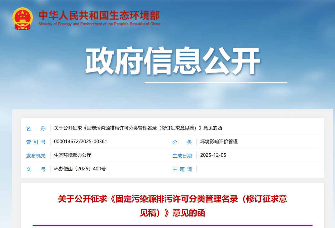 为贯彻落实党的二十大和二十届三中、四中全会精神,深化排污许可制度改革,我部组织修订《固定污染源排污许可分类管理名录(2019年版)》,形成了《固定污染源排污许可分类管理名录(修订征求意见稿)》,现公开征求意见。征求意见稿及其编制说明可登录生态环境部网站(http://www.mee.gov.cn)“意见征集”栏目检索查阅。