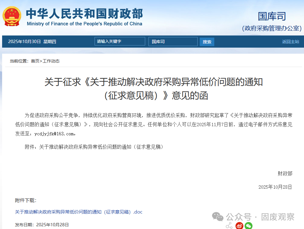 10月28日,财政部发布关于征求《关于推动解决政府采购异常低价问题的通知(征求意见稿)》意见的函。
