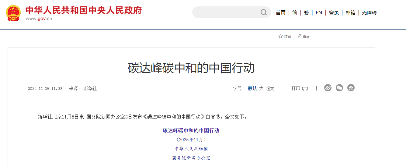 2025年是《巴黎协定》达成十周年。十年来,全球气候治理虽然历经风雨,但绿色低碳发展终成时代潮流。为全面介绍五年来中国推进碳达峰碳中和取得的重大成就,分享中国碳达峰碳中和工作的行动做法和实践经验,近日,国务院新闻办公室发布《碳达峰碳中和的中国行动》白皮书。